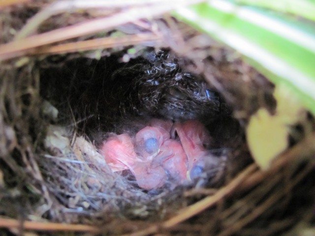 sometimes both mom and dad bird are in the nest with their babies! and they're constantly building on the nest...adding material...notice the snake shedding one of the parents found and laid across the back wall of the nest...