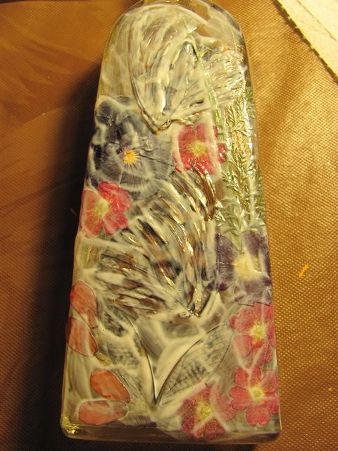 a few days ago, at the end of my post, i showed a picture of a small vintage bottle art i started working on...with pressed flowers, butterfly & dragonfly wings. i added a little paint...and took a picture with the 'mod podge' i use to coat the one decorated side of the bottle. i give it a thick coat!