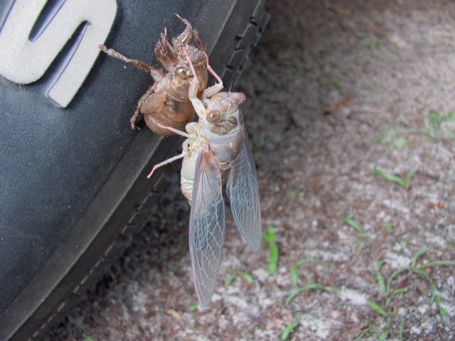 weird, huh?! i see the empty beetle shell or moltings all over the place...usually on trees...wood railings...or tires. but i've never seen this! it took me a while to search online...but finally found out what it is! it's a 'cicada'. there are 2,500 species...found all over the world. they're even a delicacy in some countries.(well, so are roaches...so that's not too surprising!) they're also known as 'jar flies' or 'july flies'. it's also a pretty rare sight to actually see one of these emerging from their former shell!! cool!! anyway, before i drove away, i took a stick and carried the cicada safely to the bushes...