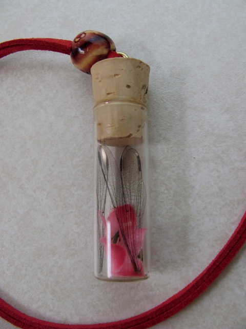 i finished another 'bottle art' piece with pressed flowers (thanks to Terica!!) and a butterfly wing!  i've added it to my etsy shop http://www.etsy.com/shop/ForestWalkArt .  the bottles i decorate are vintage...dug up by me, from a field.  the skulls...are next in line for decorating!  Oh! and the small vial/necklace in the picture has delicate dragonfly wings in it!
