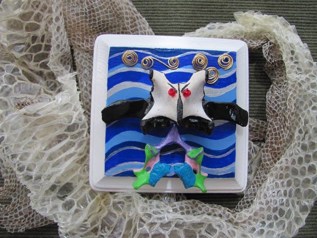 if you're keeping up with my "planet Beenderen" series...4" X 4" wood plaques which are first painted and then a 'scene' from the Bone Planet is created....WELL, i've just finished another!! this one's a little different. i painted 2 different deer vertebrae bones - one is a colorful tree - the other is the white-faced, red-eyed Beenderen Hawk...perched atop the tree. and like the other plaques, there are the wire moons in the sky!