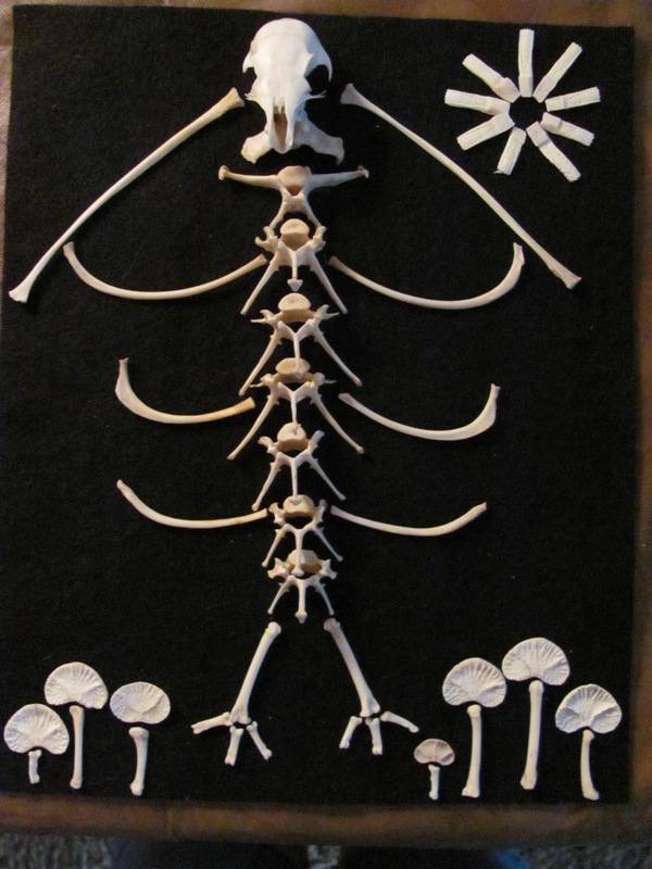 ((squirrel skull at top...raccoon vertebrae, small bones are raccoon and armadillo mix, and the little 'heart shaped' flower tops are the cushions/pads that are between the deer vertebrae))